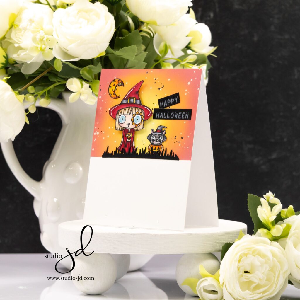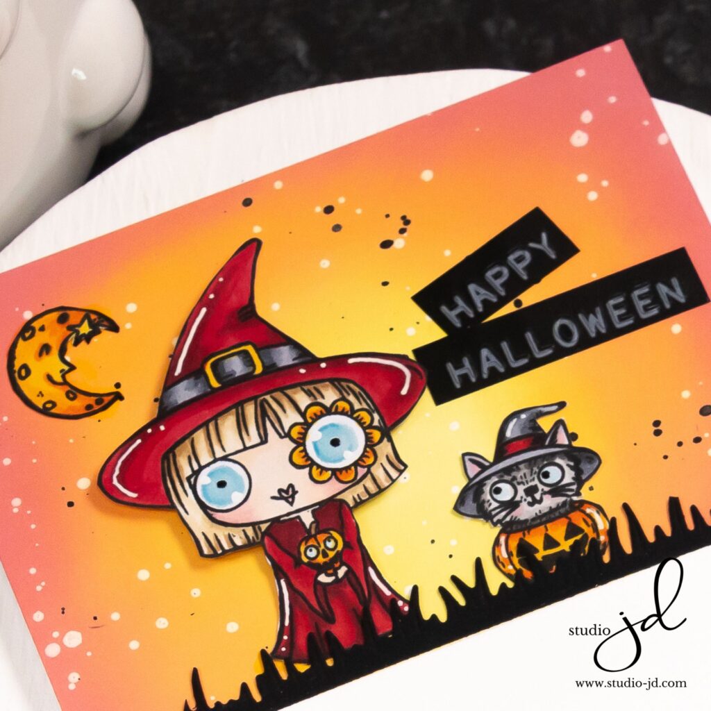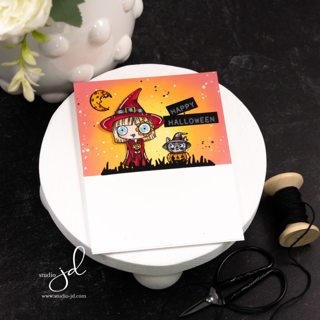Some cards just light up the craft table—literally! This Halloween design was all about embracing those fiery ink-blended colors and letting the whimsical characters from AALL & Create take center stage. With a witch, her cat, and a glowing night sky, the scene came together like a little story unfolding at dusk.
