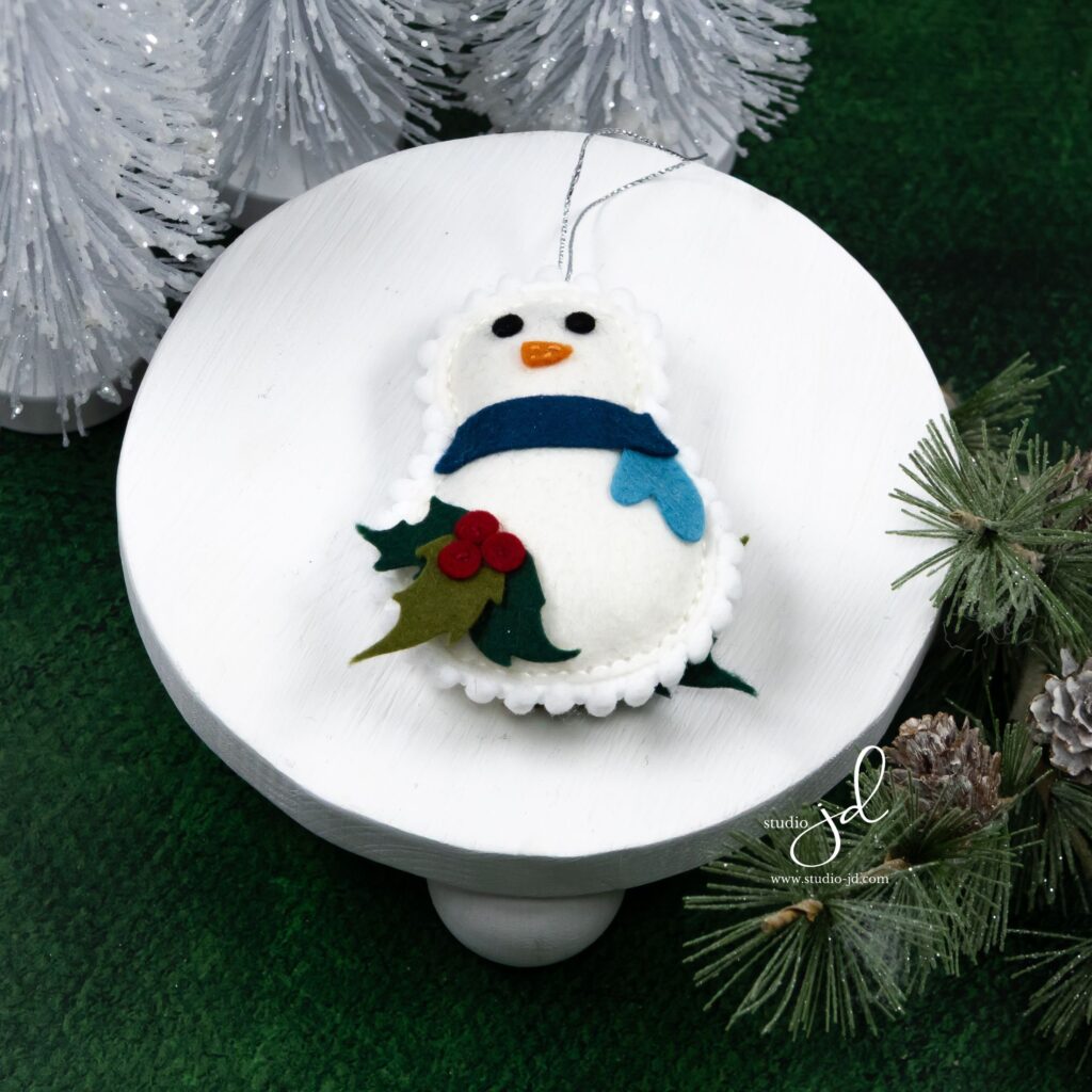I wanted him to have a bit of personality, so I added a few holly leaves and bright red berries from the Stocking Gift Card Holder die set that came out last year. For a little extra texture, I stitched a piece of pom pom trim around the edge and stuffed the ornament lightly so it has a soft, dimensional shape. He’s just the right mix of cheerful and cozy—ready to hang on the tree or to tie onto a wrapped gift.