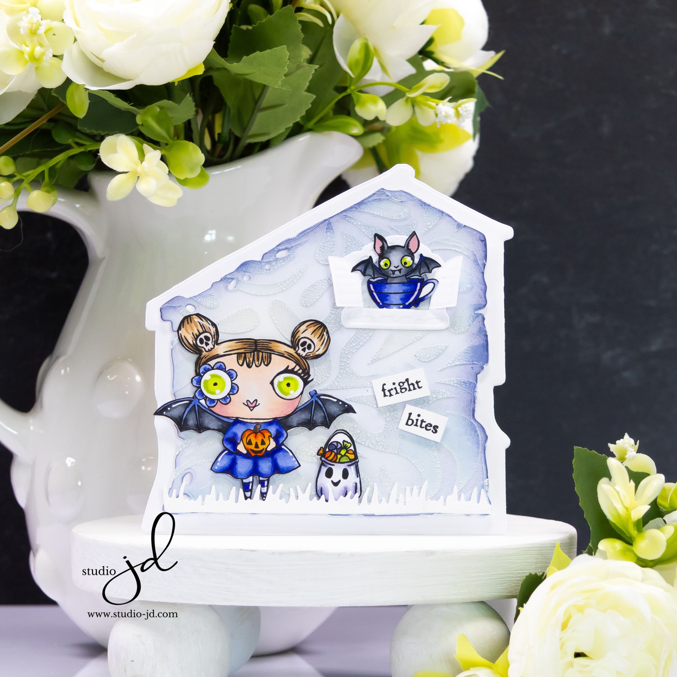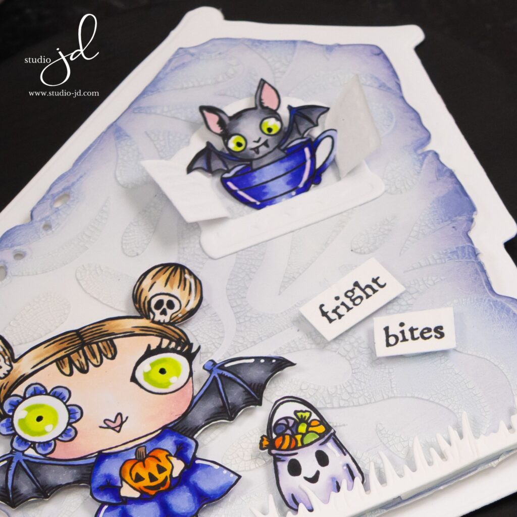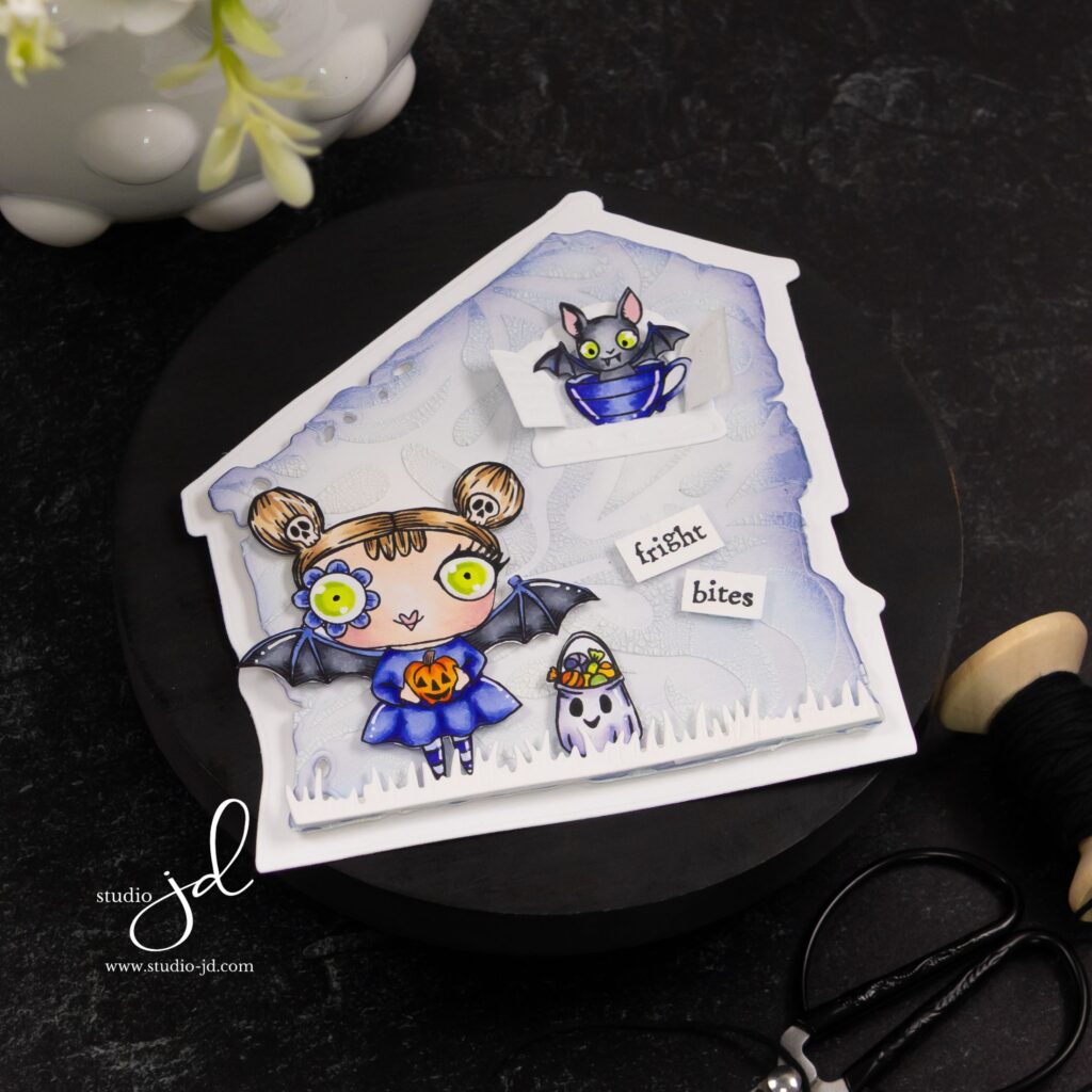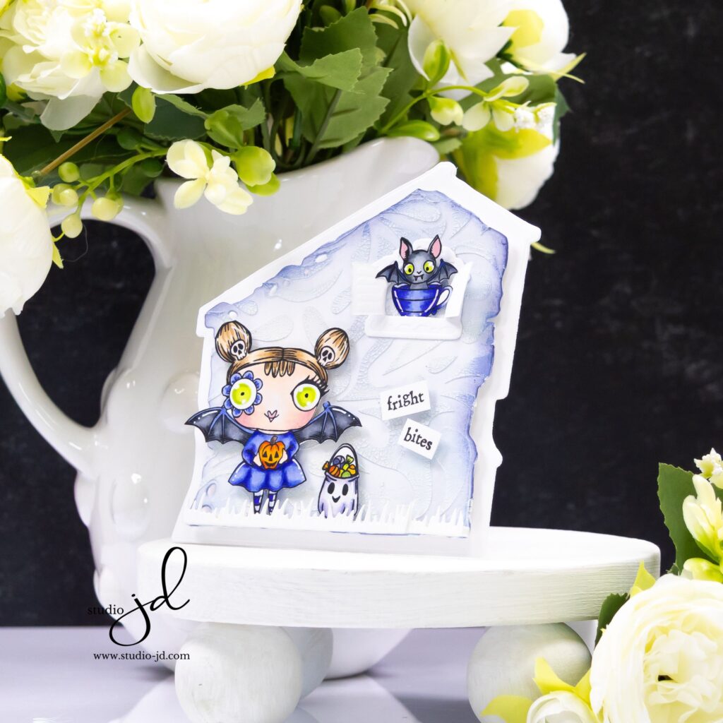 Some projects make you grin as you’re creating them. This spooky-cute Storybook House was one of those. Between the candy-toting ghost, the wide-eyed little girl with bat wings, and the tiniest bat peeking from a teacup and opening the shutters, this card practically staged its own Halloween play while I was working on it.