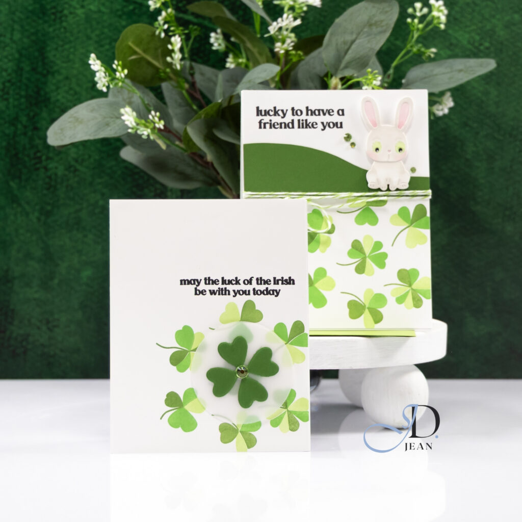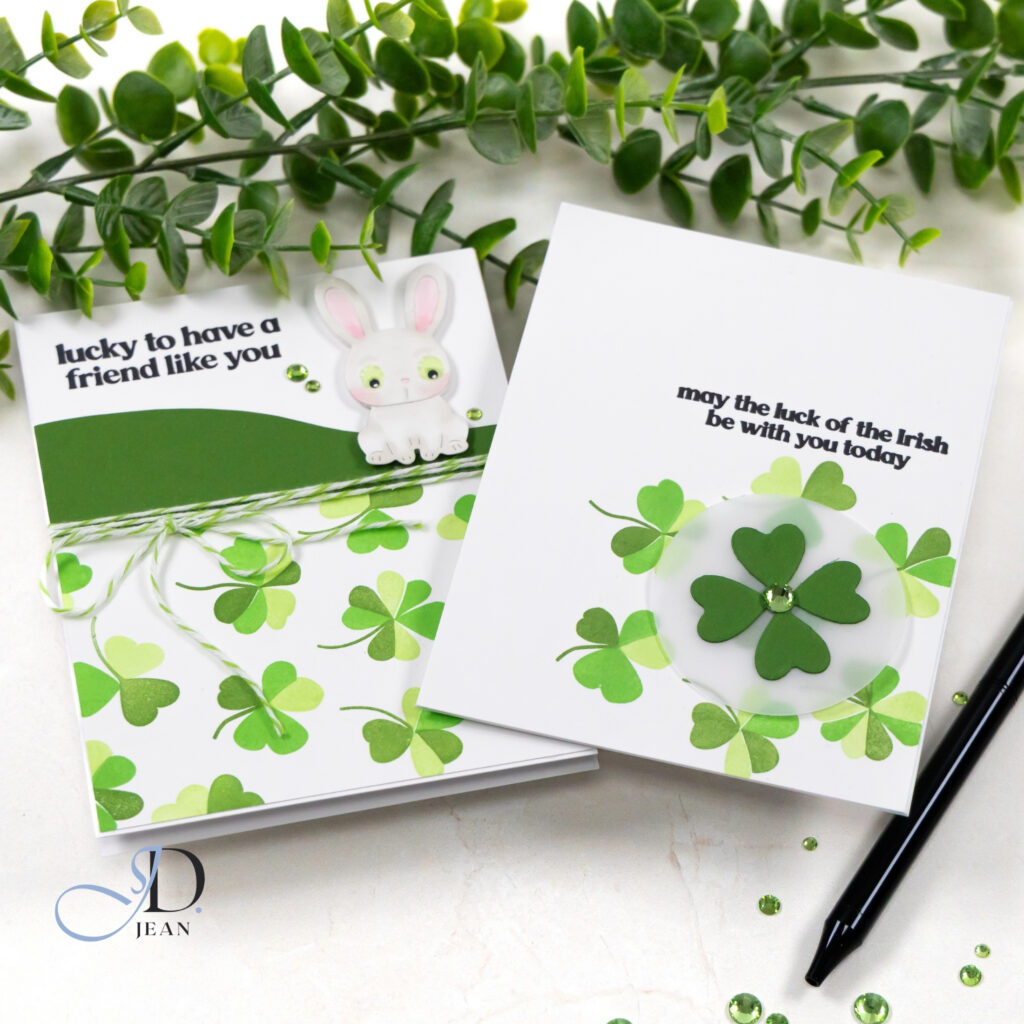 Both designs celebrate a little luck in completely different ways. One leans clean and modern with layered die cuts and subtle dimension. The other brings in pattern, texture, and a sweet focal image for a playful twist. Together they feel cohesive but distinct, which is always my favorite kind of pairing for a multi-card post.