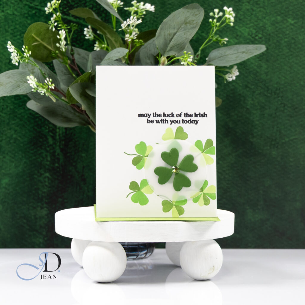 At the center, I layered a dimensional four-leaf clover over a translucent vellum circle. The vellum softens everything beneath it and creates a subtle halo effect that pulls the eye inward. Instead of filling the entire space, I allowed the outer shamrocks to “float” with a bit of breathing room. That negative space keeps the design feeling fresh and modern.