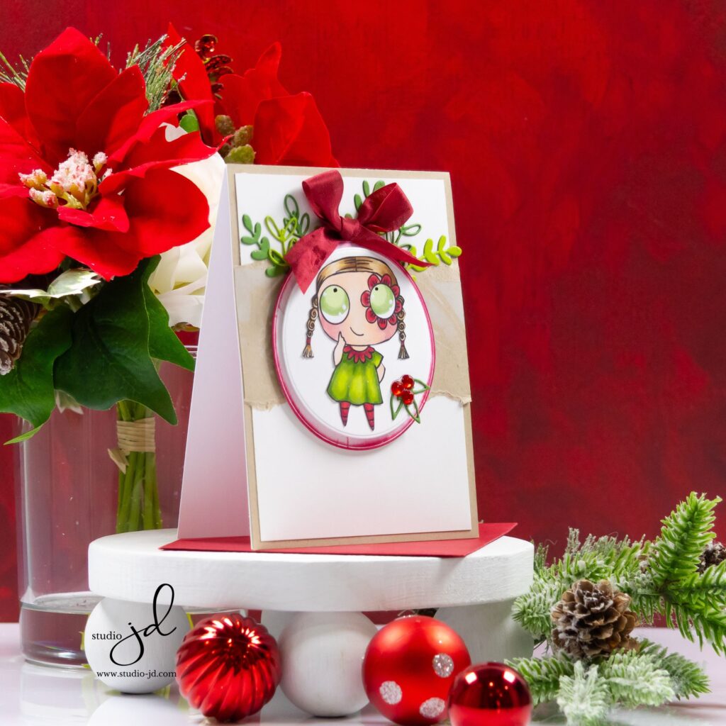Holiday crafting always invites a little extra playfulness, and this card felt like a chance to lean into every cheerful detail. I started with an ornament-style frame and let this sweet AALL & Create character take center stage. She wasn’t designed as a holiday stamp, but she has already proven she can dress for the season, so she’s doing it again here with bright greens, berry reds, and plenty of charm.