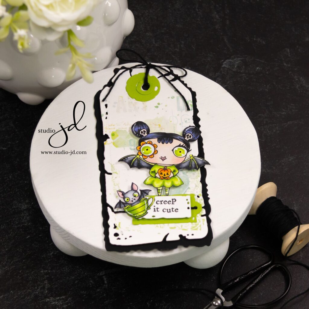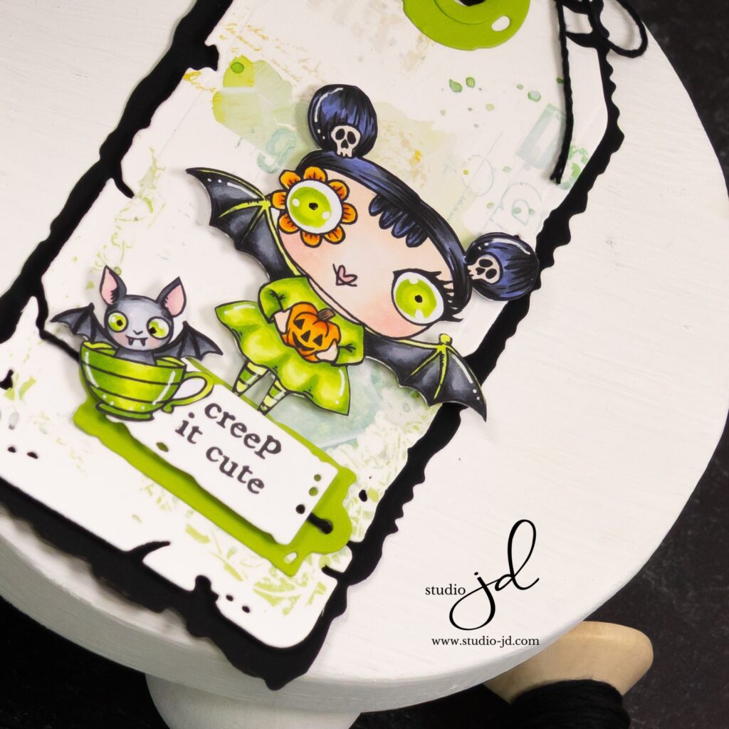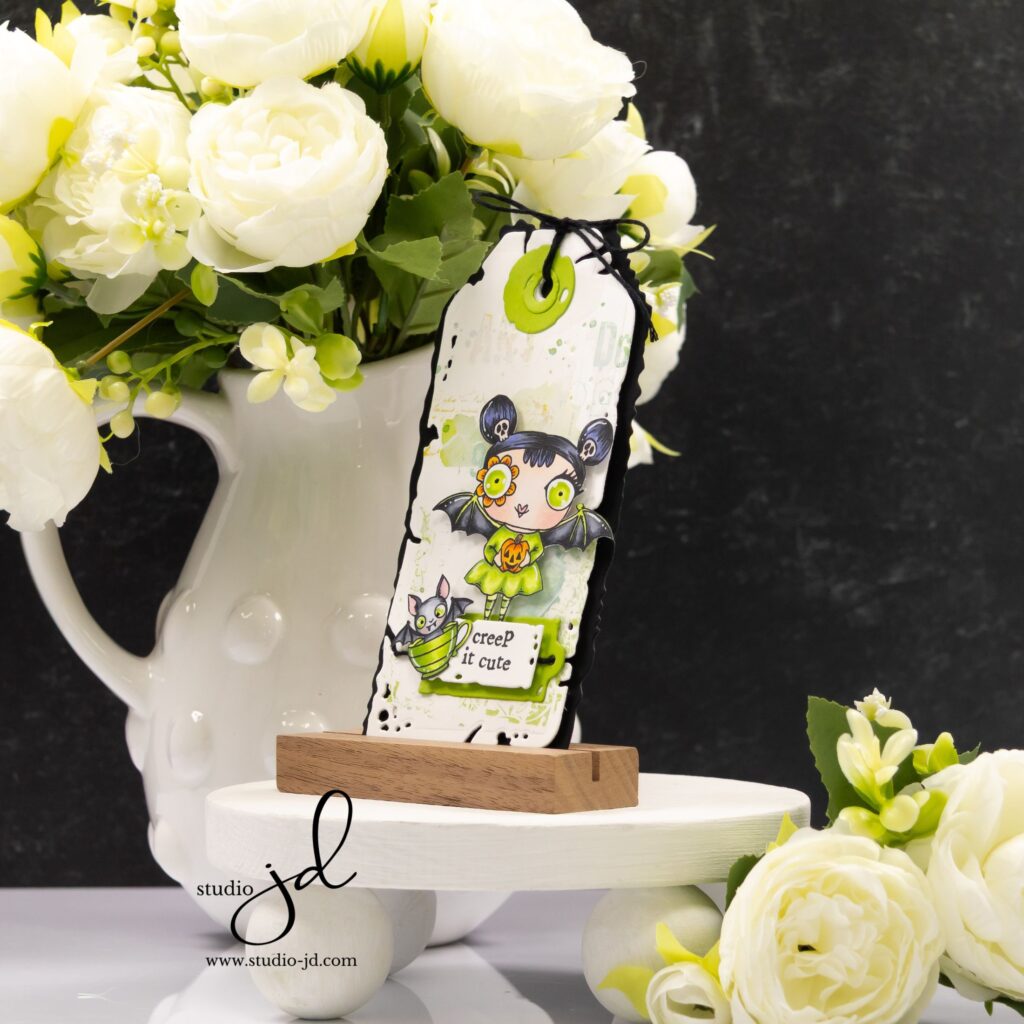 Sometimes you just have to let your project lean all the way into adorable spookiness. This tag is a perfect example—it’s equal parts quirky, playful, and perfectly creepy-cute thanks to the fun characters illustrated by Janet Klien for AALL & Create.