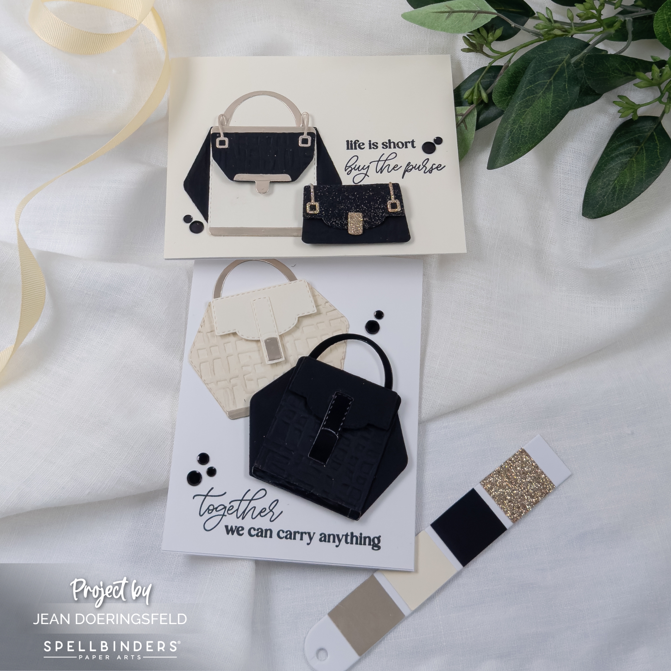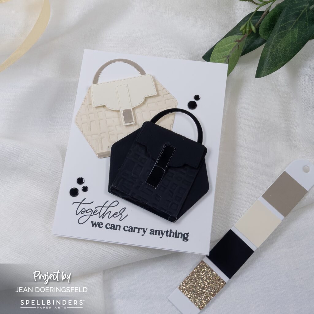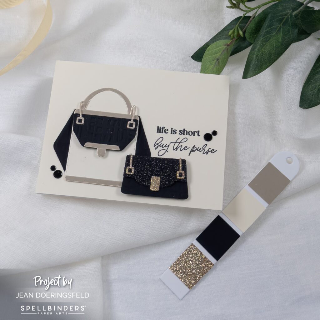 Contrast drives the first design, using finish to define each element. I paired matte and glossy black surfaces with a touch of glitter to create separation without introducing additional color. Keeping the layout open allows those differences in texture to stand forward, while the sentiment is placed to balance the weight of the handbag without competing for attention.