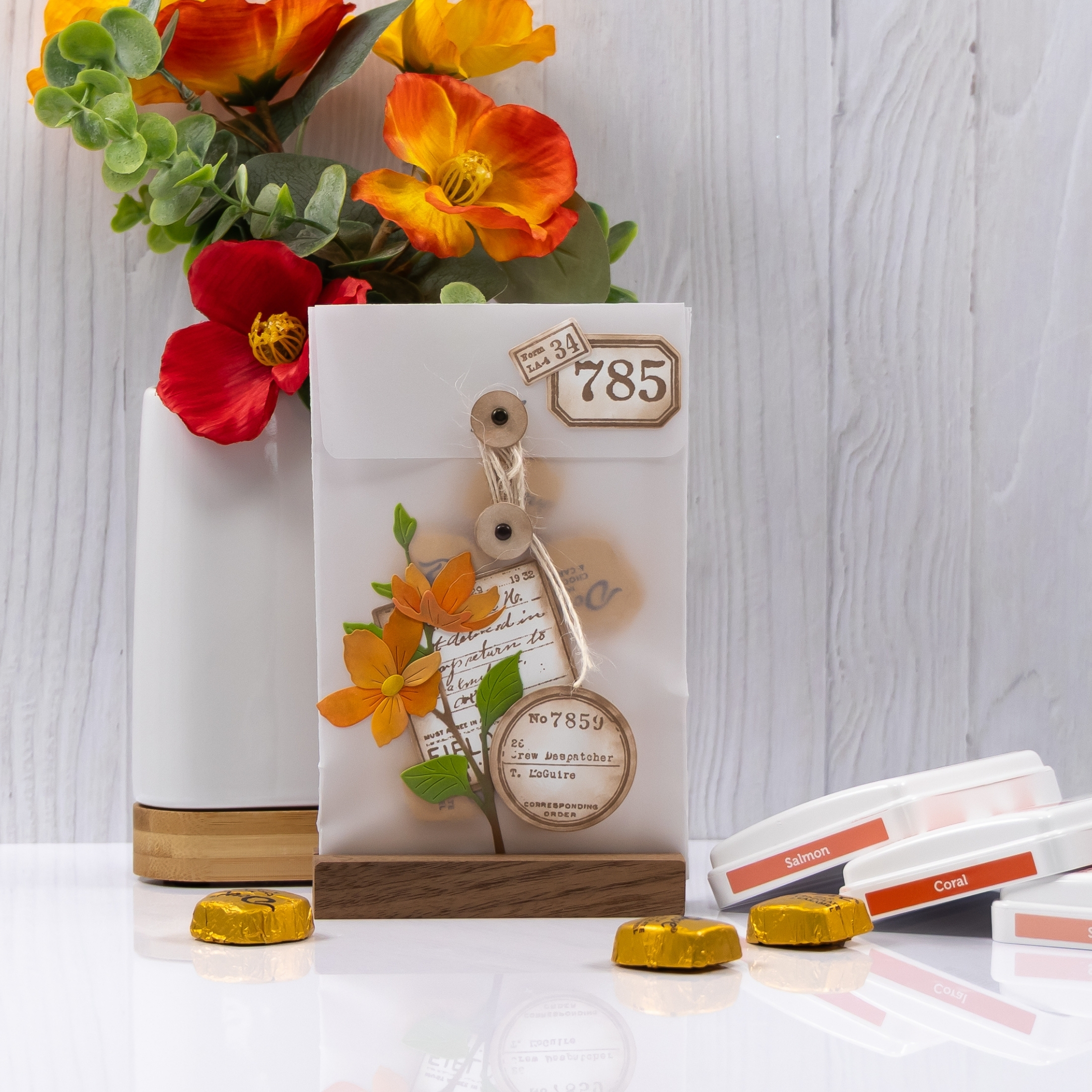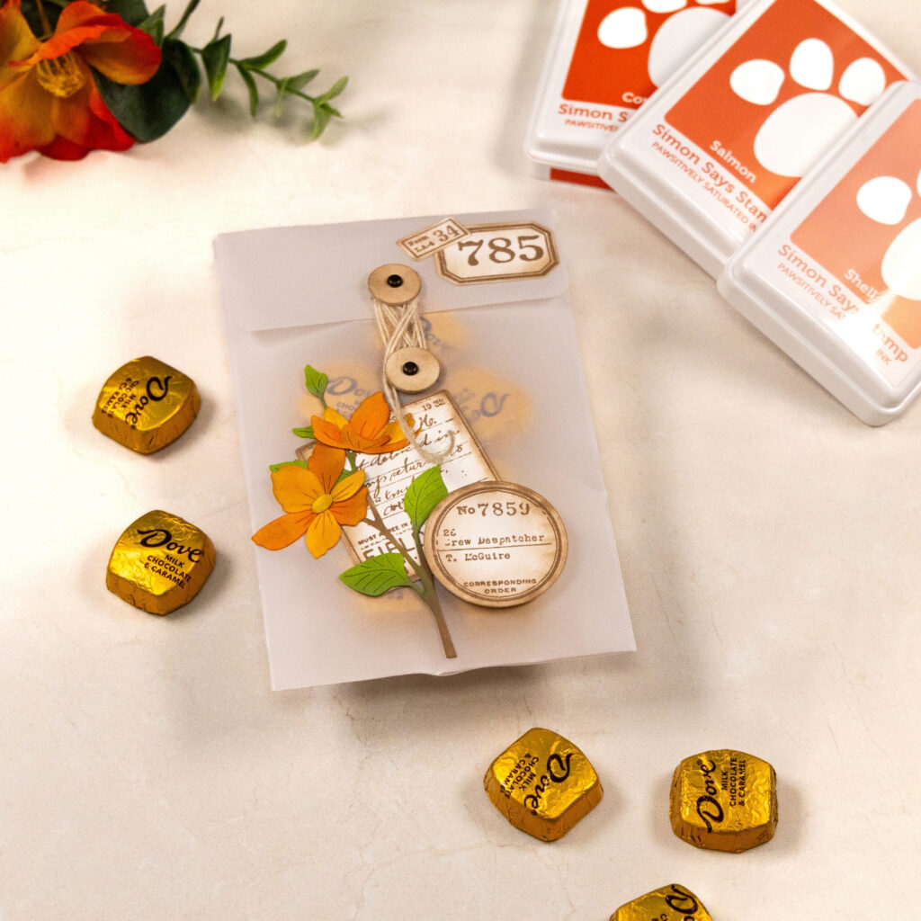The soft translucency emphasizes the stamped details while still giving the die-cut florals and ticket elements room to shine. Using warm ink tones for the numbers and labels helped everything feel cohesive with the coral and orange blooms, especially against the muted background of the bag.