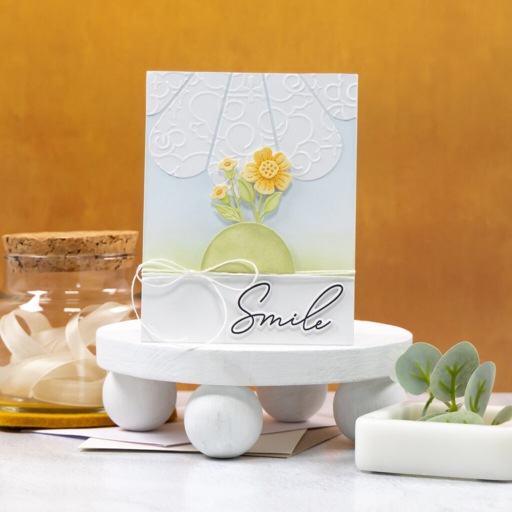 The first card features a soft, sky-inspired background with layered florals rising from a curved hill. Subtle embossed details add texture without overpowering the design, letting the florals take center stage. A simple sentiment and white twine keep the overall look light and serene.