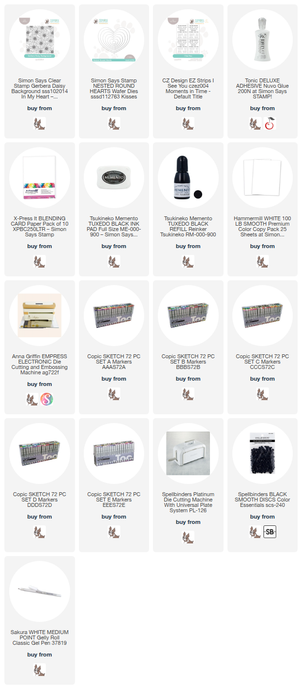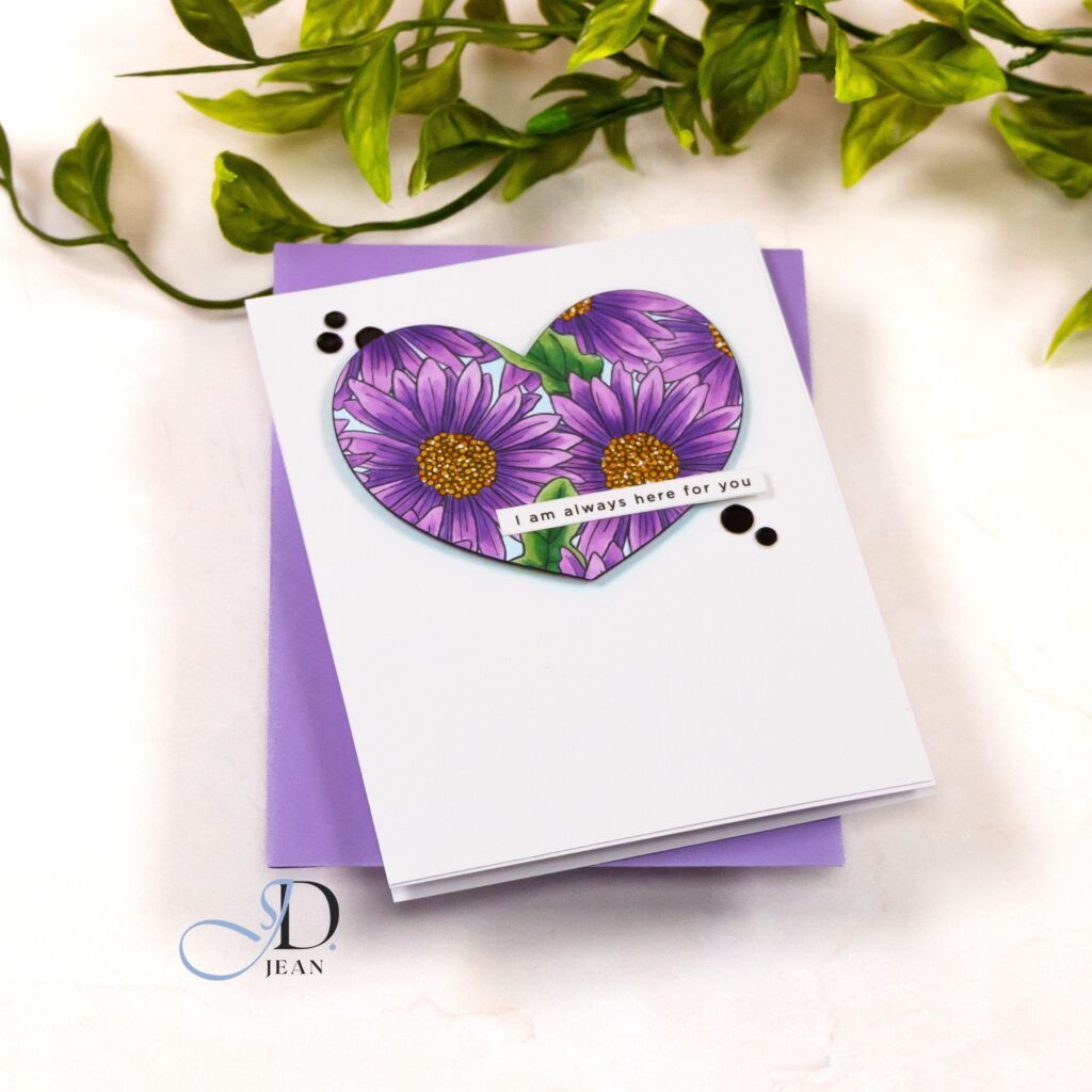 This card features the Gerbera Daisies Background stamp from the new Simon Says Stamp “In My Heart” release. I chose a rich purple palette for the flowers because it creates a bold color story while still feeling elegant against the clean white card base. The golden centers anchor the composition and help guide the eye across the heart.