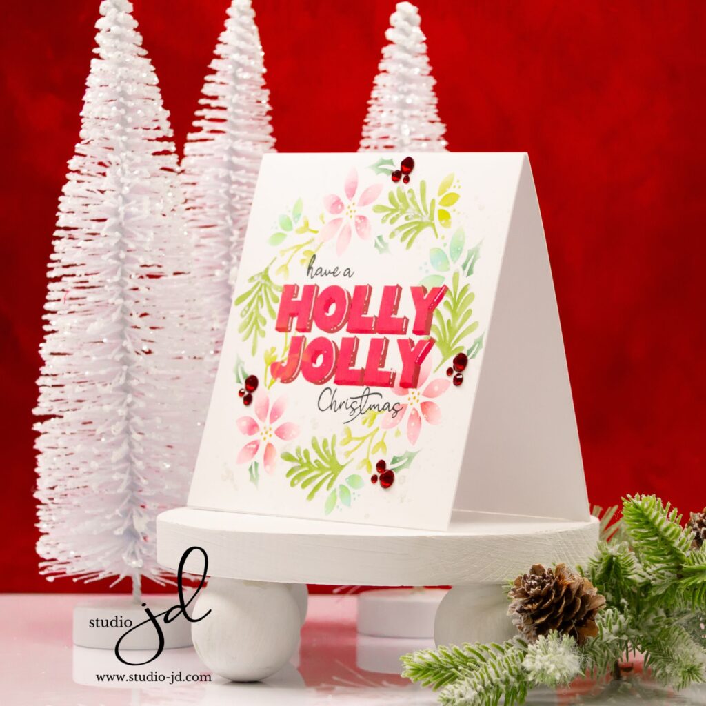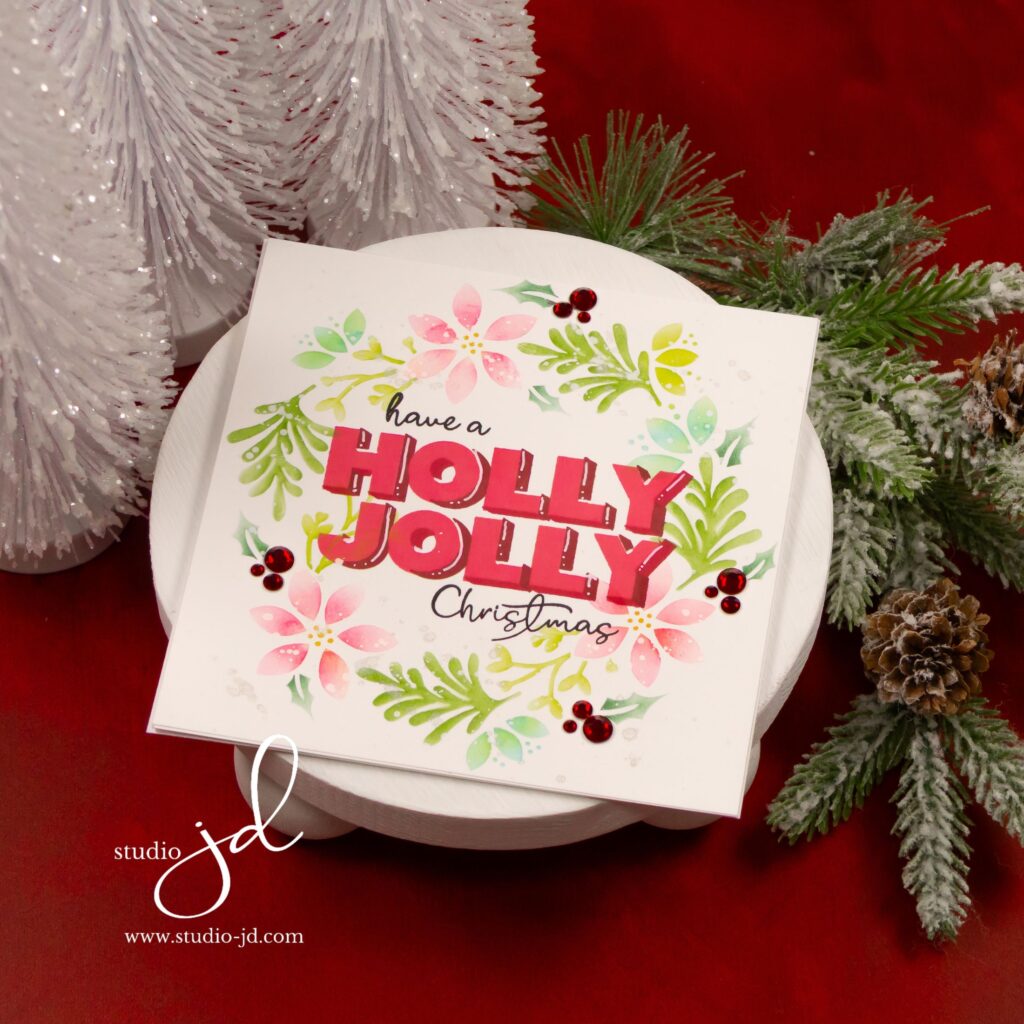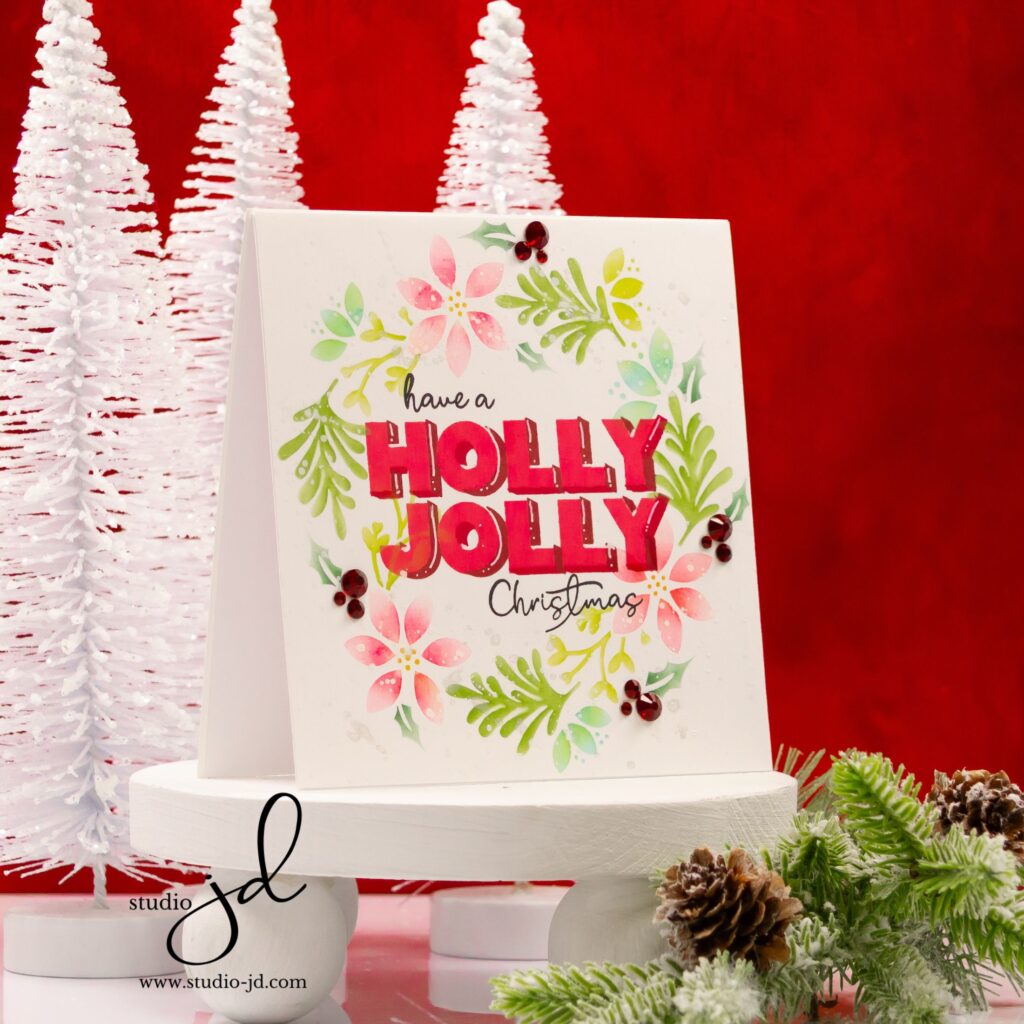 The moment I saw the new Holly Jolly Layering Stamp set from this release, I knew it would bring instant holiday cheer to my craft table. Paired with an older Christmas Wreath Stencil I knew this card would be one of those designs that practically sings “Merry and Bright” — bold lettering, playful florals, and a color palette that just feels happy.