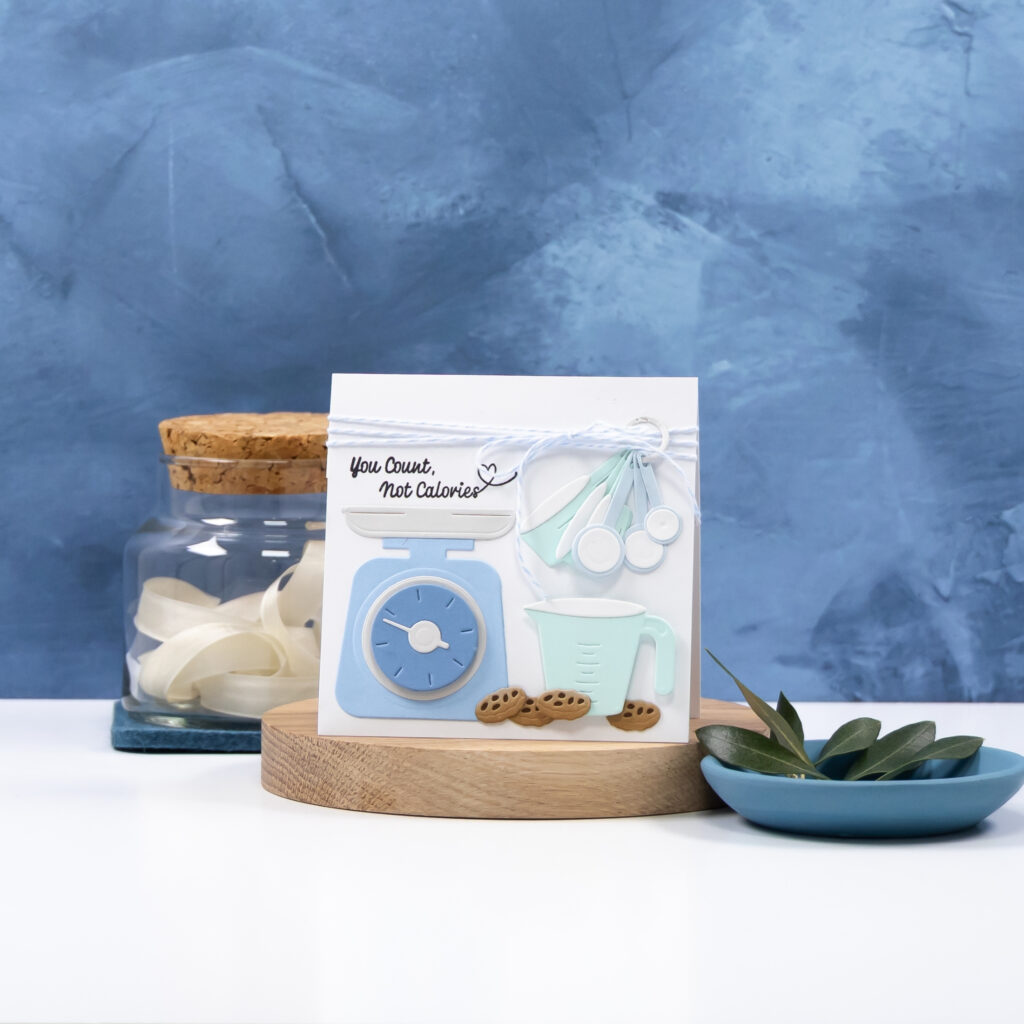 The final card shifts into a cooler color palette with soft blues and minty greens. The scale, measuring cups, and mixing pitcher make this design feel calm and orderly, almost like the quiet moment before the baking begins. It is a gentle contrast to the warmer tones of the other two cards and rounds out the collection beautifully.