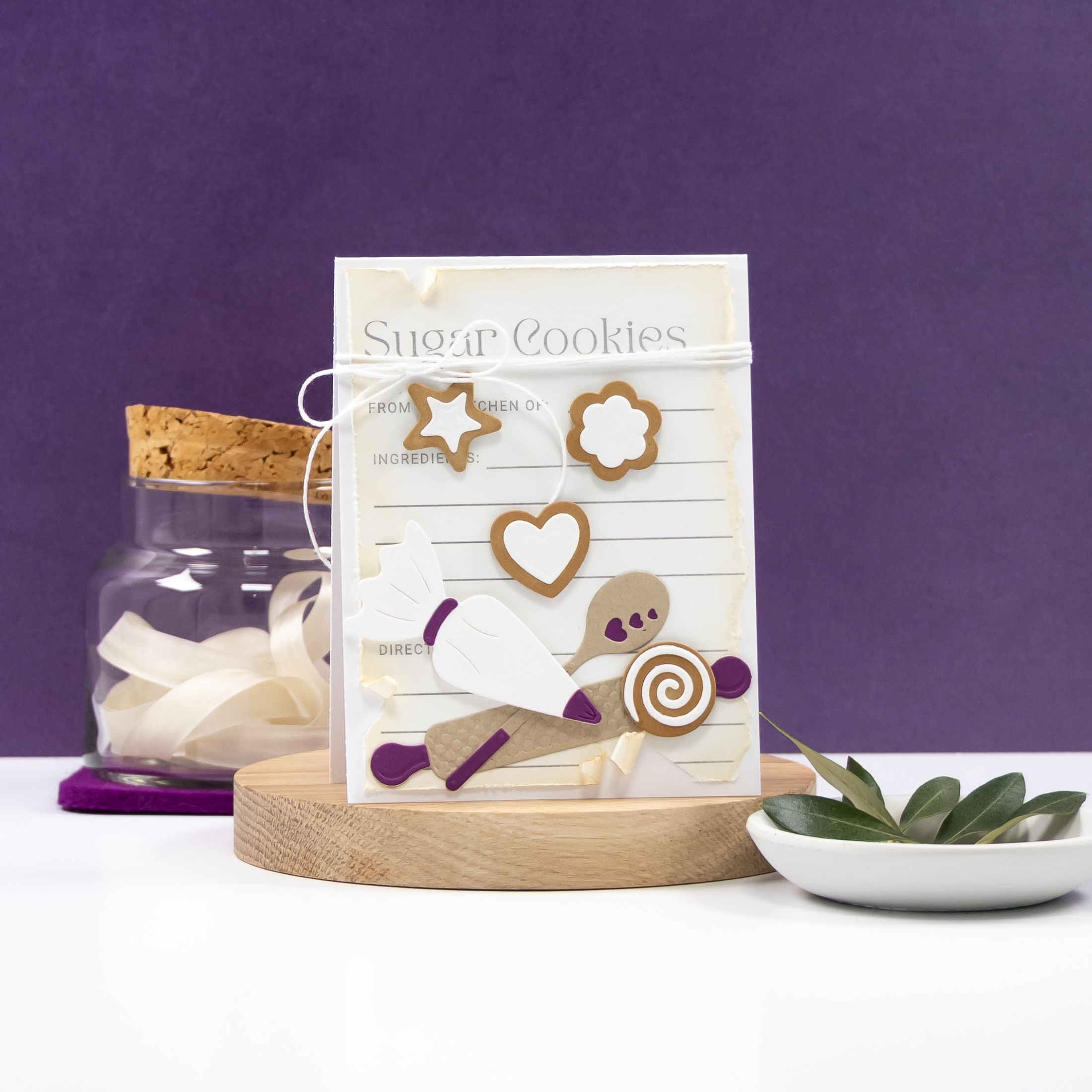 This card leans into a warm, cozy palette with soft cream tones, kraft accents, and just a pop of rich purple. The recipe card background sets the scene, while the piping bag and cookie shapes add playful dimension. A bit of twine at the top gives it that well-loved recipe card feel, like something pulled straight from a kitchen drawer. I used a Canva template to create the recipe card (one that I use at home regularly, but I changed the colors to make it cohesive with the design).