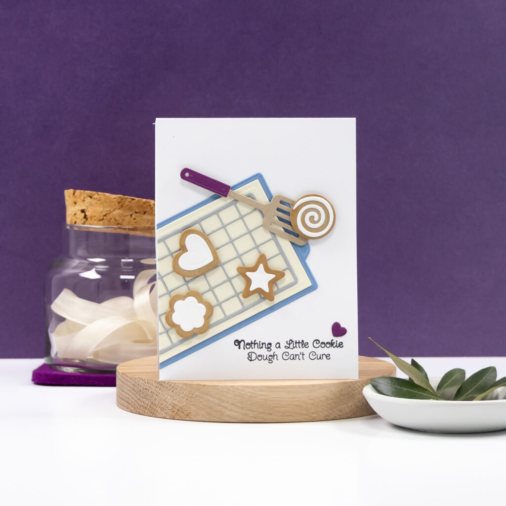 For the second card, I kept the background clean and let the die-cut layers do the work. The cooling rack creates instant structure and movement, and the cookies scattered on top add a lighthearted, freshly baked vibe. This one feels bright, graphic, and fun while still tying back to the rest of the set.