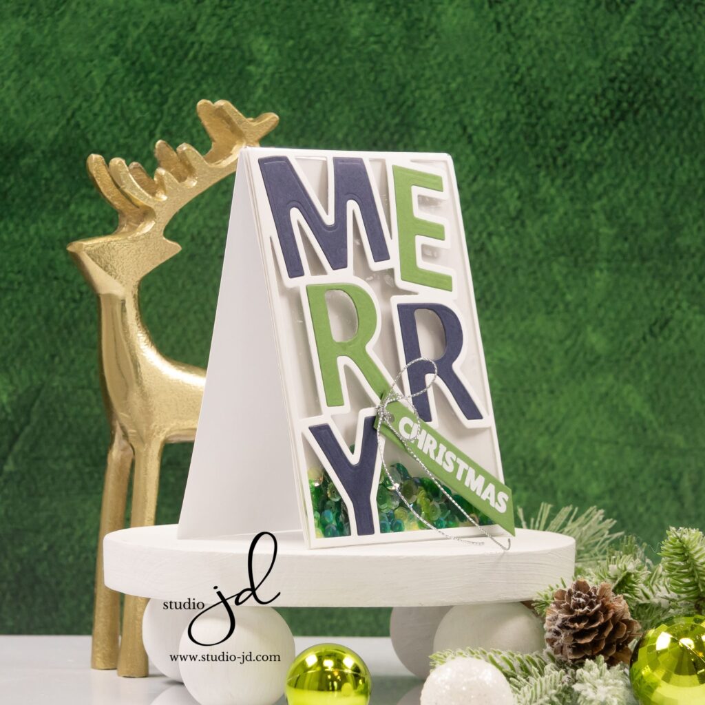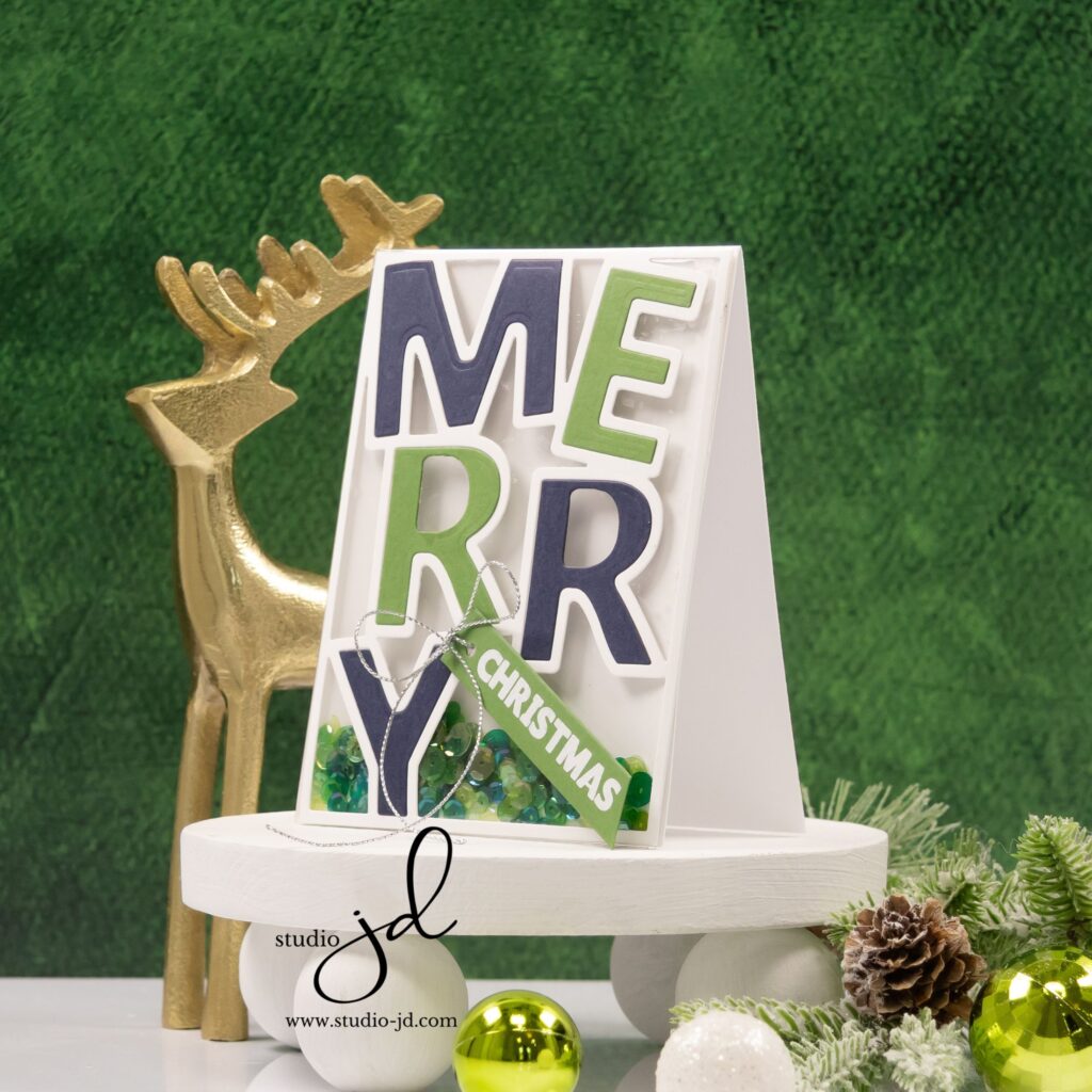 I went bold with color (navy and green — crisp, modern, and just a little unexpected) and filled the shaker with sequins that catch the light like holiday lights on a tree. The chunky typography makes the perfect backdrop for all that sparkle, and the diagonal sentiment strip adds the finishing “Christmas” touch with a wink.