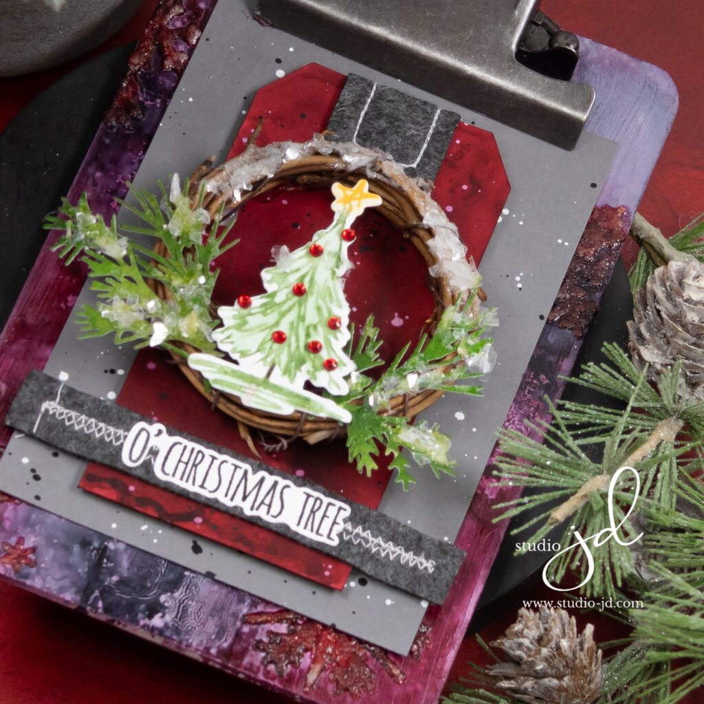 For this project, I wanted to create something that felt both rustic and elegant — like a handcrafted ornament come to life. The small tree, framed within a grapevine wreath, sits atop a layered tag backdrop in deep red and gray tones. With touches of snow, greenery, and metallic accents, this piece feels like a warm holiday greeting wrapped in texture and joy.