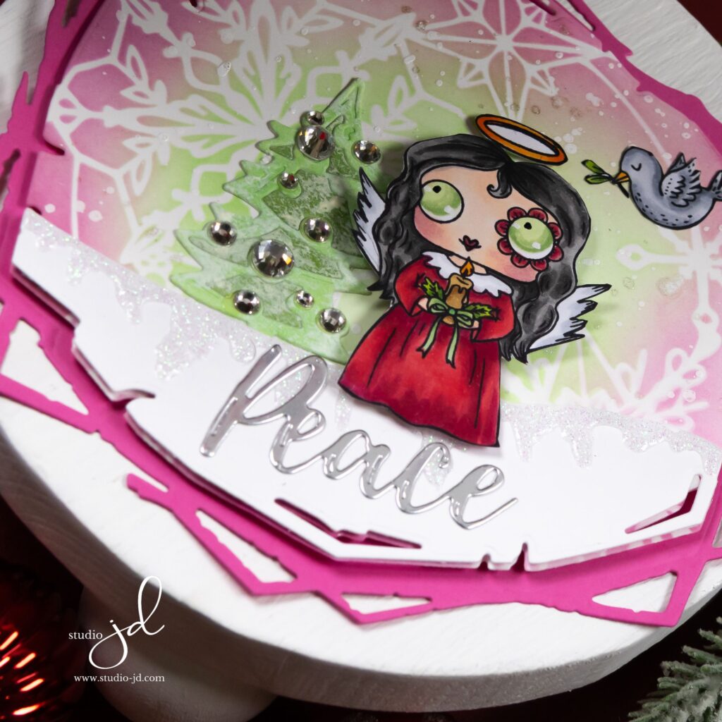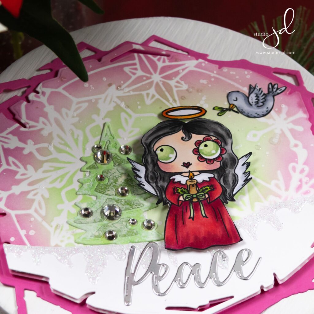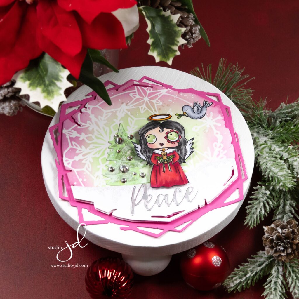 To frame it all, I stacked a rosy geometric frame and tucked in a silver “Peace” sentiment. The quiet layers, the soft color shifts, and a few metallic droplets make the whole piece feel like a calm carol at candlelight.