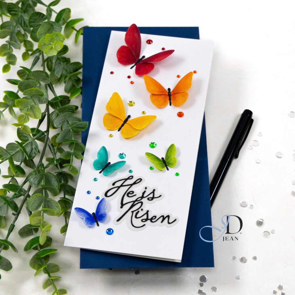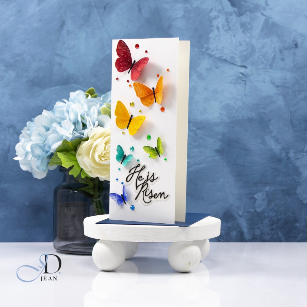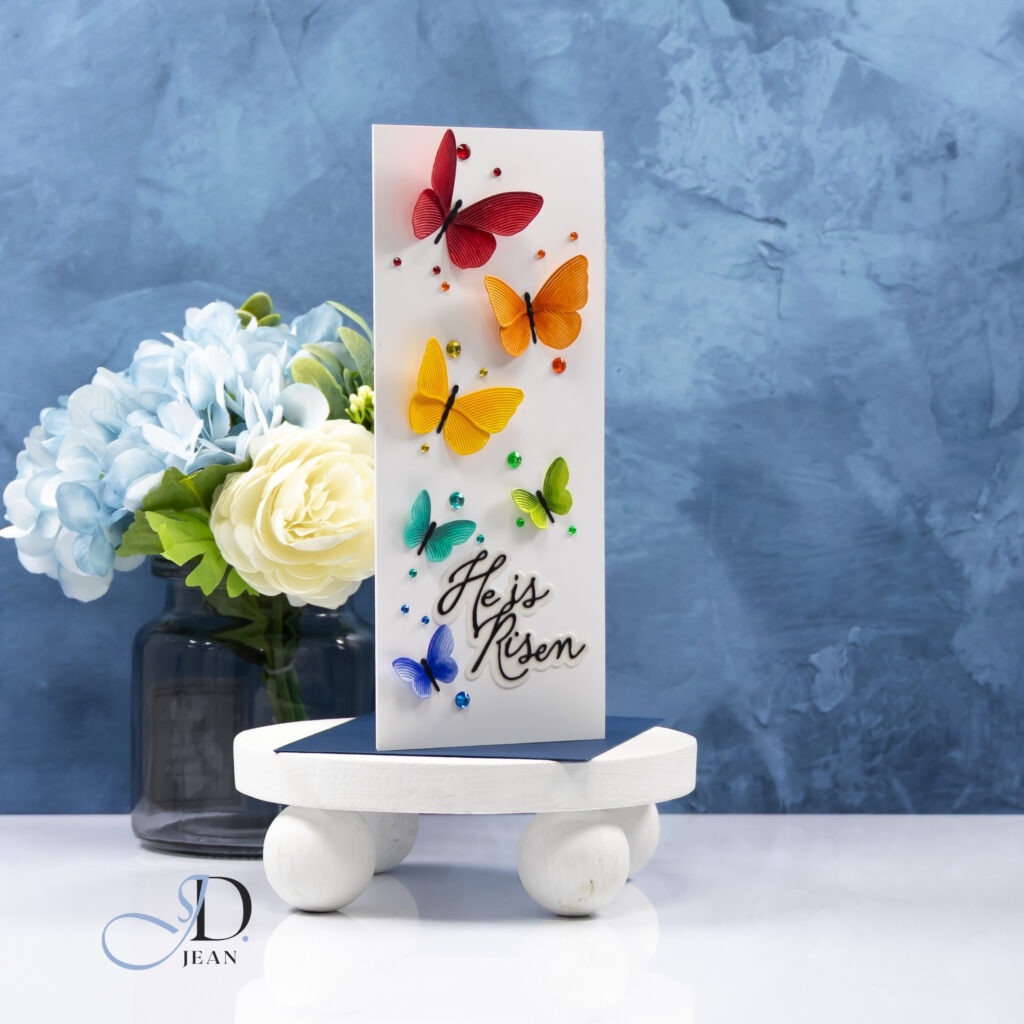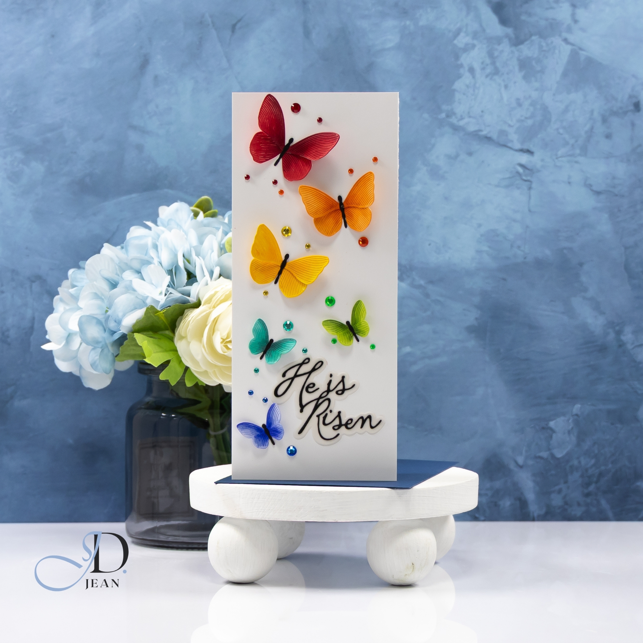 The tall slimline format gives that movement room to breathe. Instead of crowding the butterflies together, the vertical space allows each one to feel intentional while still contributing to the overall cascade. It creates a sense of lift that pairs beautifully with the message of the “He Is Risen” sentiment.