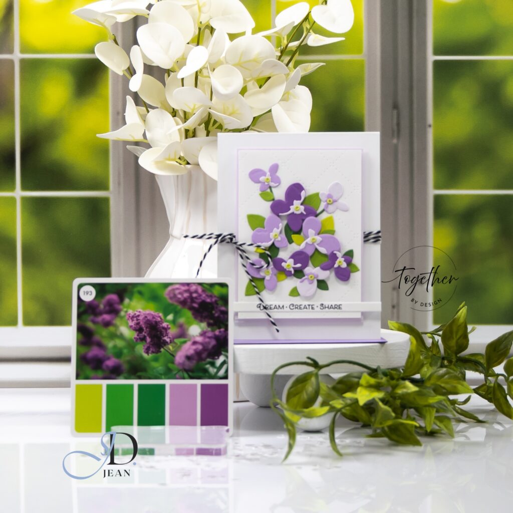 The tall stem card brings the palette back into a more defined, graphic interpretation. Using Copic-colored die cuts, I leaned into stronger contrast and cleaner edges. The vertical layout creates a clear sense of movement, guiding the eye upward along the stem. The deeper purple tones become more pronounced here, which helps ground the design against the white space and keeps it from feeling too delicate.
