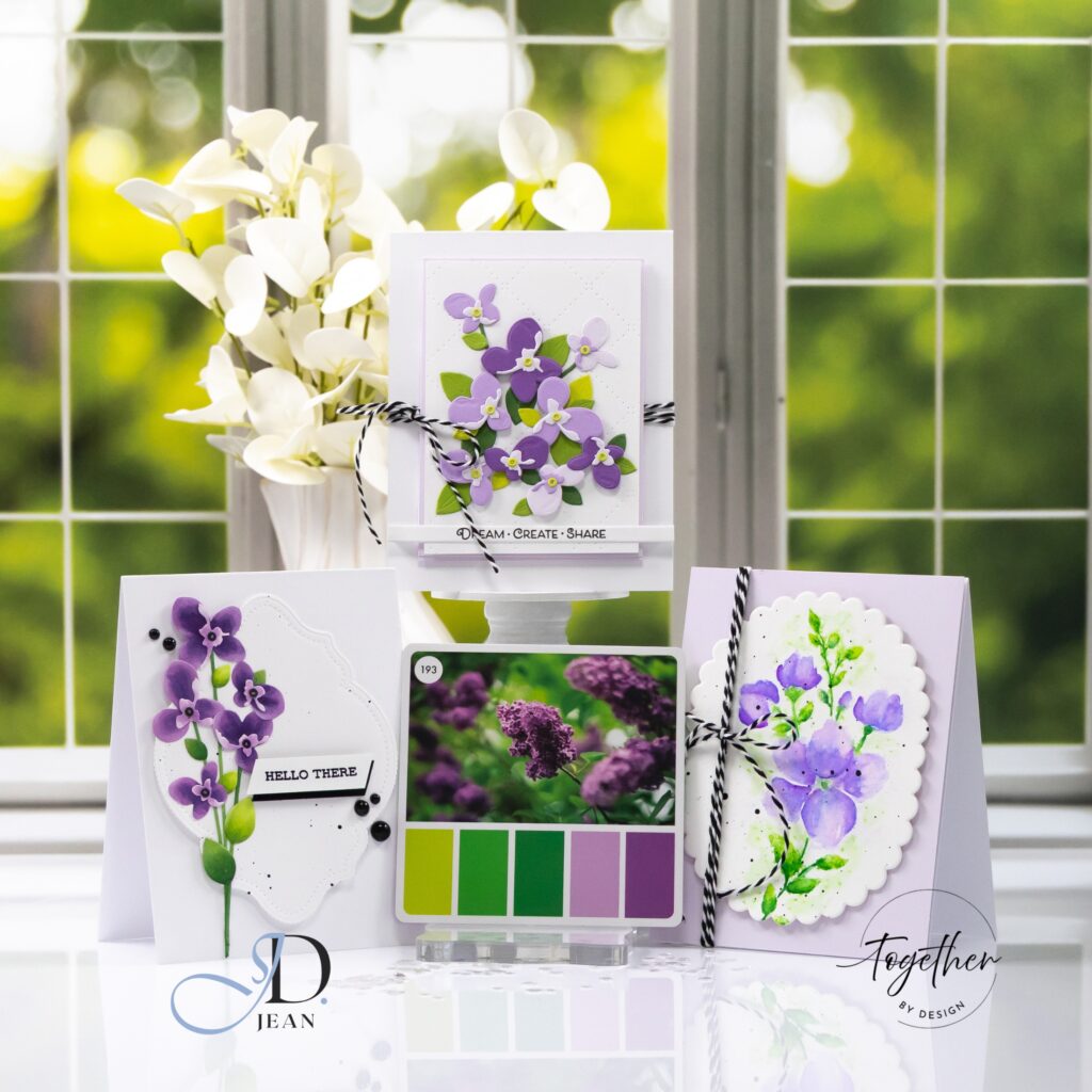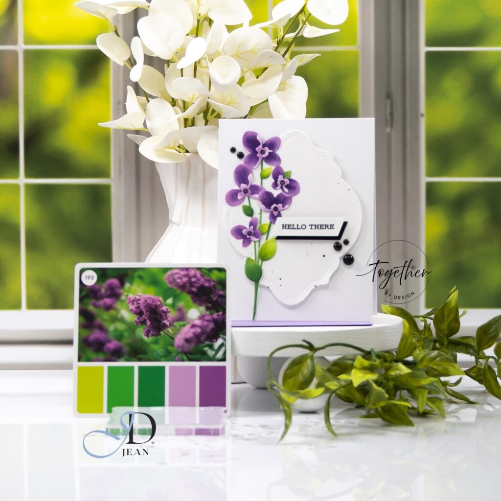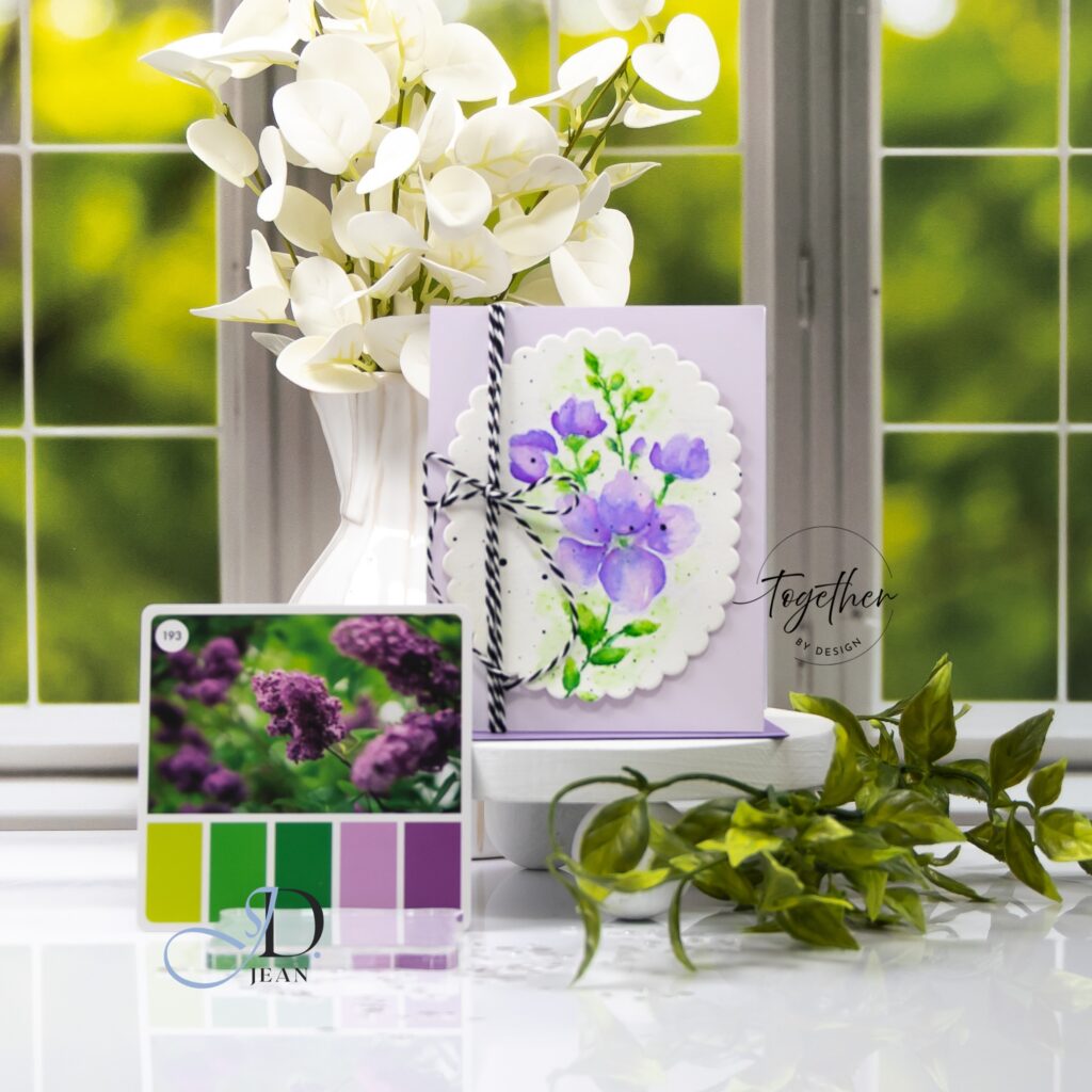 The watercolor stamped card shifts the palette into something softer and more fluid. Here, the same purples become more blended and atmospheric, with subtle variation in saturation across the petals. The greens feel slightly more organic and loose, which reinforces the watercolor style. The scalloped oval frame helps contain that softness and gives the design a gentle structure so it doesn’t drift too far visually.