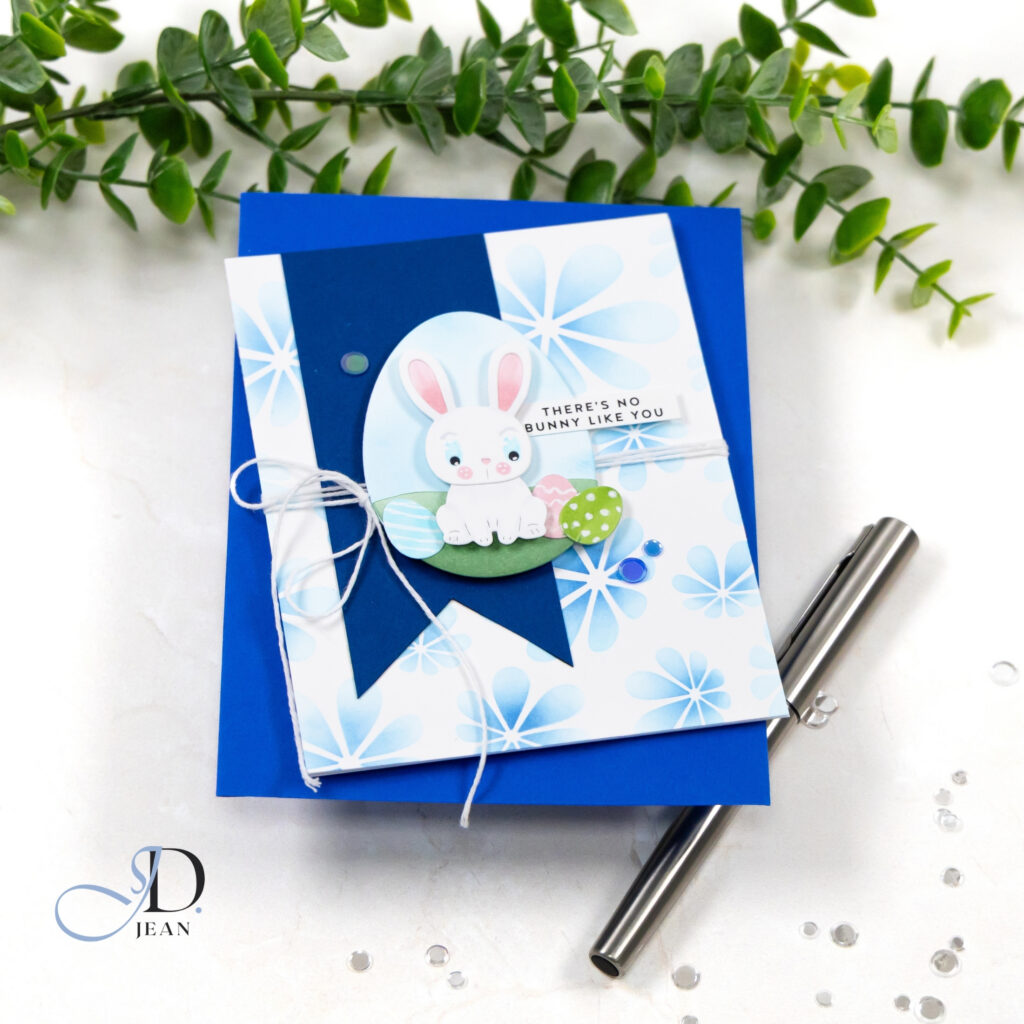 Texture adds another layer of balance to the design. Wrapping twine across the card introduces a gentle horizontal element that offsets the vertical banner while adding a bit of tactile detail. Small gems echo the cool blue palette and bring a subtle sparkle that keeps the design lively without disrupting the calm spring feeling.