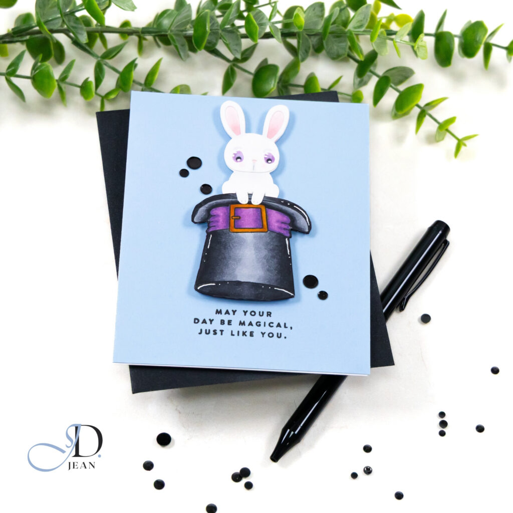 Contrast plays an important role here. The darker hat anchors the composition and allows the lighter bunny to stand out clearly against the background. With fewer surrounding elements, the eye moves directly to the focal image and the whimsical story it suggests. A few simple embellishments add a touch of sparkle while keeping the overall layout clean and intentional.