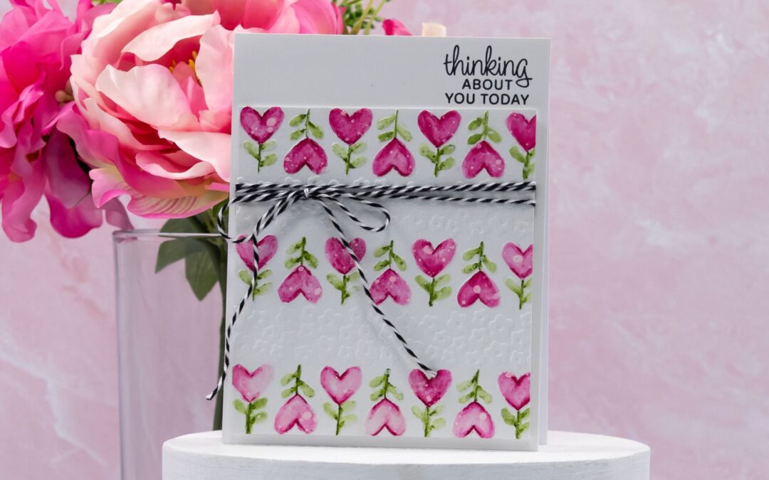 Today I’m sharing an elegant card I made using the Anemone Wreath stamp set from the Simon Says Stamp “To Love” release. You all know I love florals and this stamp is fantastic! It’s filled with beautiful anemones that are perfect for coloring! And, it’s huge! It makes a 6×6 wreath, which I cut in half for this card (and saved the rest for another day)!
