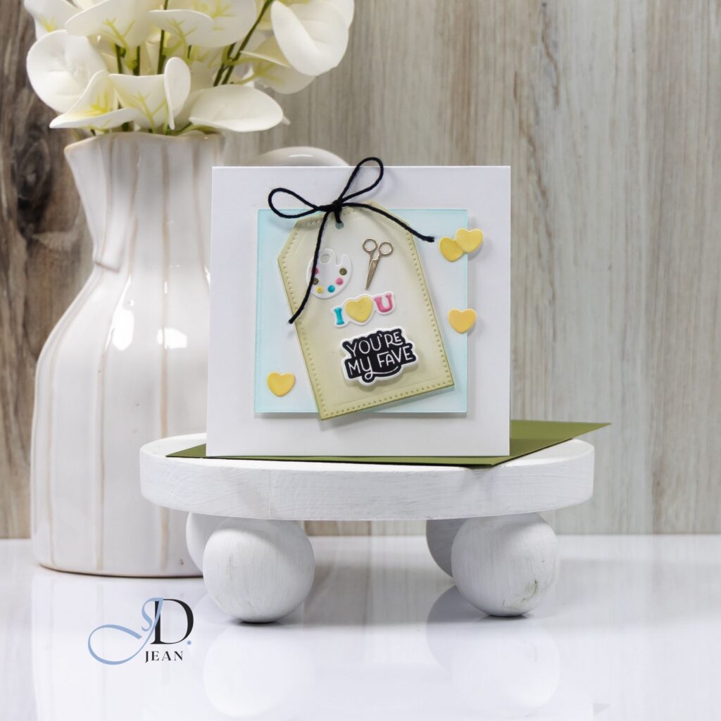 The tag naturally frames the tiny craft icons while the layered panel underneath helps separate the focal area from the white card base. A simple twine bow reinforces the handmade theme and introduces soft texture.